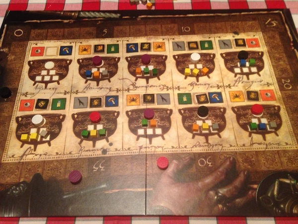 The rules are very simple. There are five different ingredient colors that can be used to create up to ten potions. Each potion generates exactly two ingredients of pre-determined colors but it's up to the player creating the potion to determine the number and colors of ingredients to use and how much victory points to get for creating it. The catch is that while you only get the victory points once, each other player can copy your recipe by using the similar ingredients over and over again.