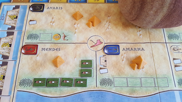 between pleasing Amun-Re (to further farming and get power cards) and displeasing Him (to further caravans and get gold), and