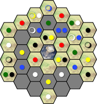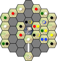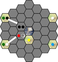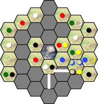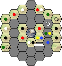 The meeples are denoted with colored circles; filled in the hexes they stand in