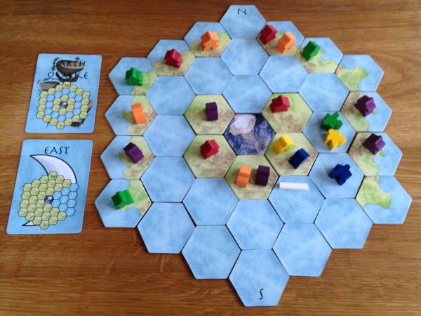 but decides to go for East, hoping that the other players will push the black meeples to danger.