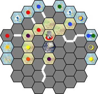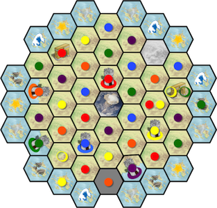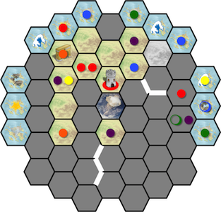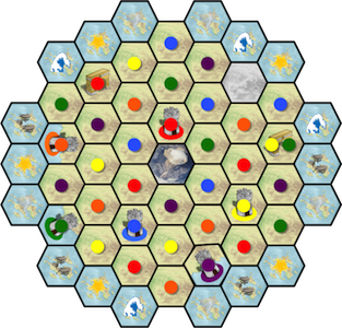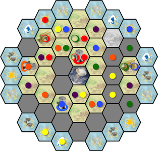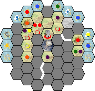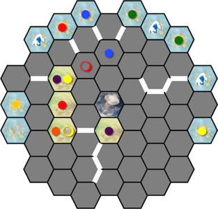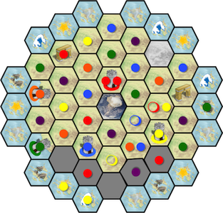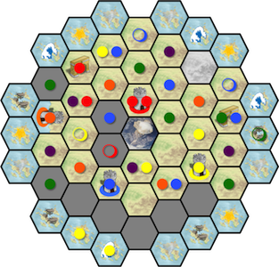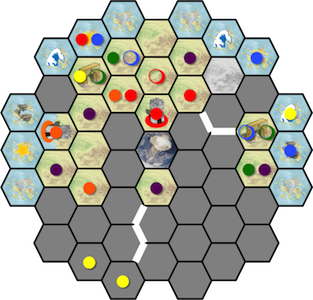 The meeples are denoted with colored circles; filled in the hexes they stand in