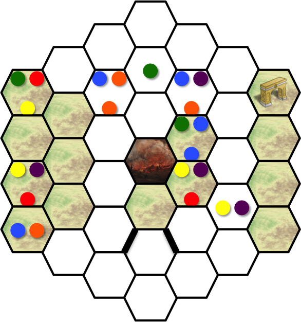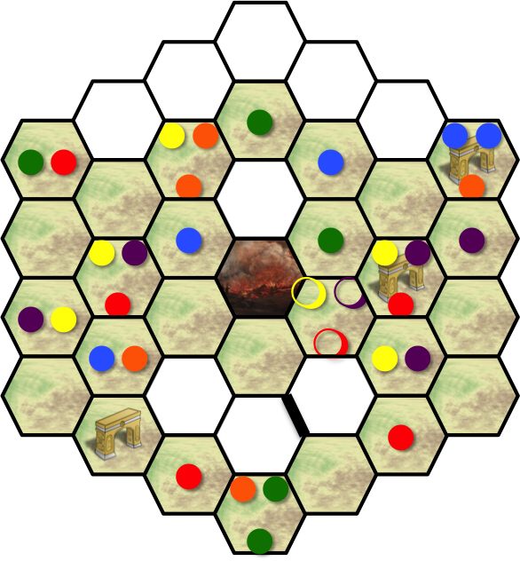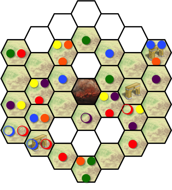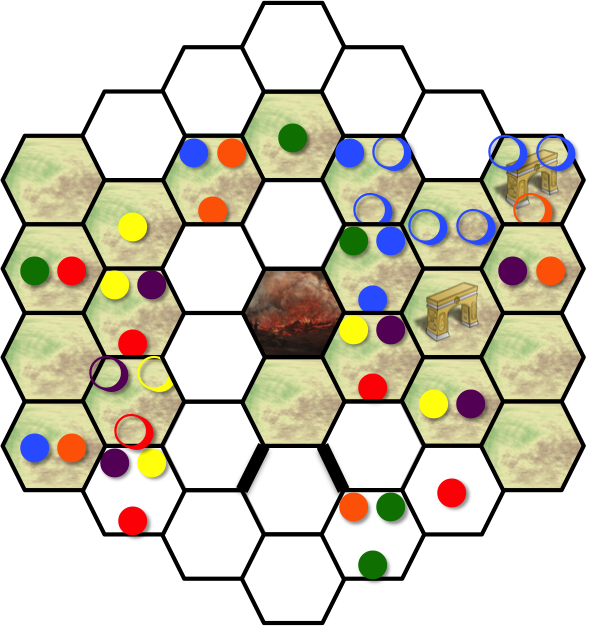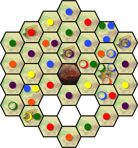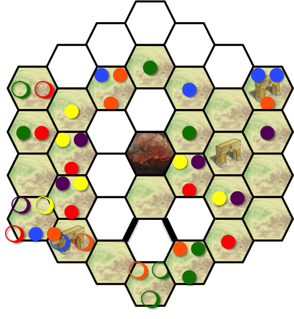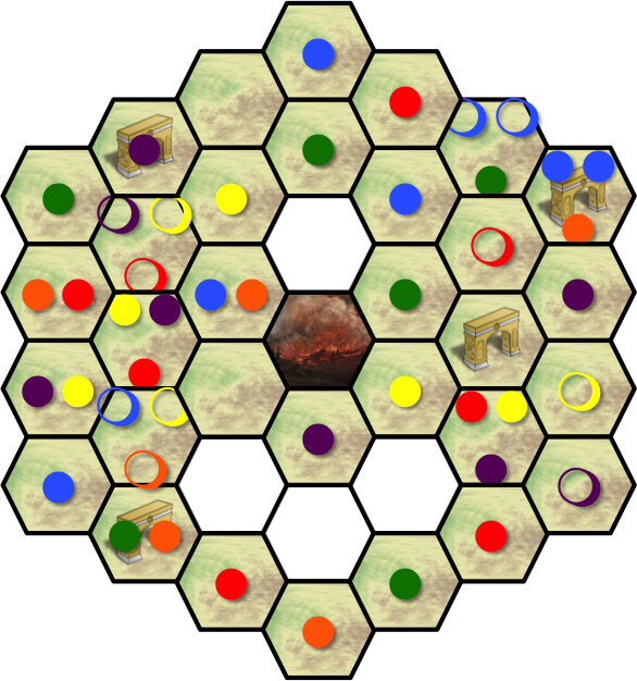 The meeples are denoted with colored circles; filled in the hexes they stand in