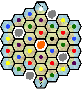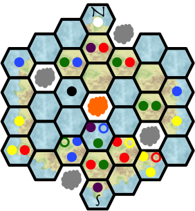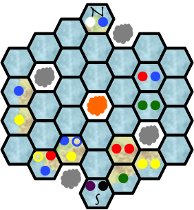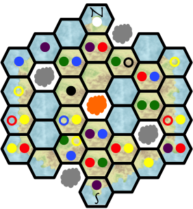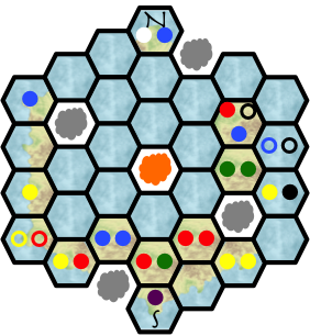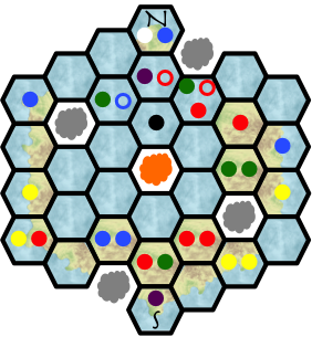 The meeples are denoted with colored circles; filled in the hexes they stand in