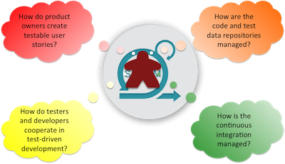Our agile test game should answer the same questions as before about role, goal, challenges and decisions. Since agile testing activities are closely linked to development activities, let us put our players in the roles of scrum masters with the goal of coding components through test driven development and continuous integration. The code is represented by colored cubes and the components by tiles illustrating input codes and output codes.
