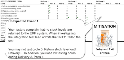 How about the mitigation cards you might wonder? Yes, they are also used now. As in all test projects, the unexpected happens, and as all good testers, the students are expected to be prepared for the unexpected. The teachers reveal unexpected events and the students must play their mitigation cards (and motivate why they mitigate the specific event) to avoid issues.