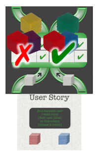 The challenge for the players is to ”develop code” (acquire cubes) and ”test components” (place cubes) until the user story can be considered ”done” (the input codes placed on the components match the input codes required by the user story).