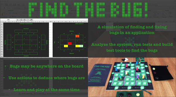 Find the Bug applies several testing concepts. The players represent test leads, responsible for assigning testers to analysis, design, test and automation tasks. The game board simulates a multitier architecture with 3 tiers and 3 modules. Using the principles of risk-based testing, the players must assess the business criticality and technial complexity of the solution and plan the tasks accordingly to find as many bugs as possible. In just half an hour, the players will have experienced an entire test project!