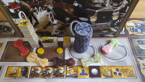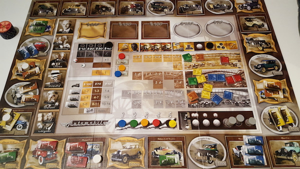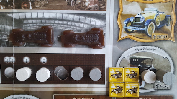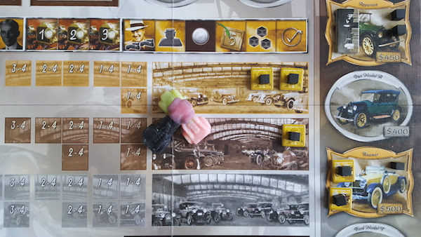 The factory spaces are neatly arranged in a clockwise pattern around the game board where each new space introduces a more modern (and more expensive) car model. This looks a bit like, although I shudder to mention the game in the same sentence as Automobile, how the streets in Monopoly are organized. Rest assured that there are no other similarities between those games!