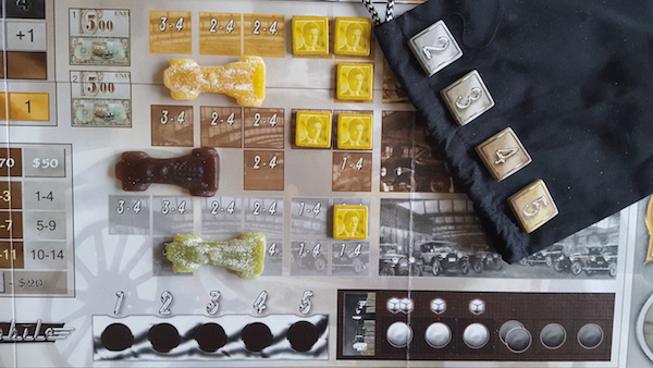 Ah, finally we get to sell the cars and get our well-deserved (and needed) money. The sales do not cost an action and thanks to the demand tiles and the salesmen, you have a pretty good idea about how many cars that will be sold. This should be a peaceful affair, right? Certainly not.