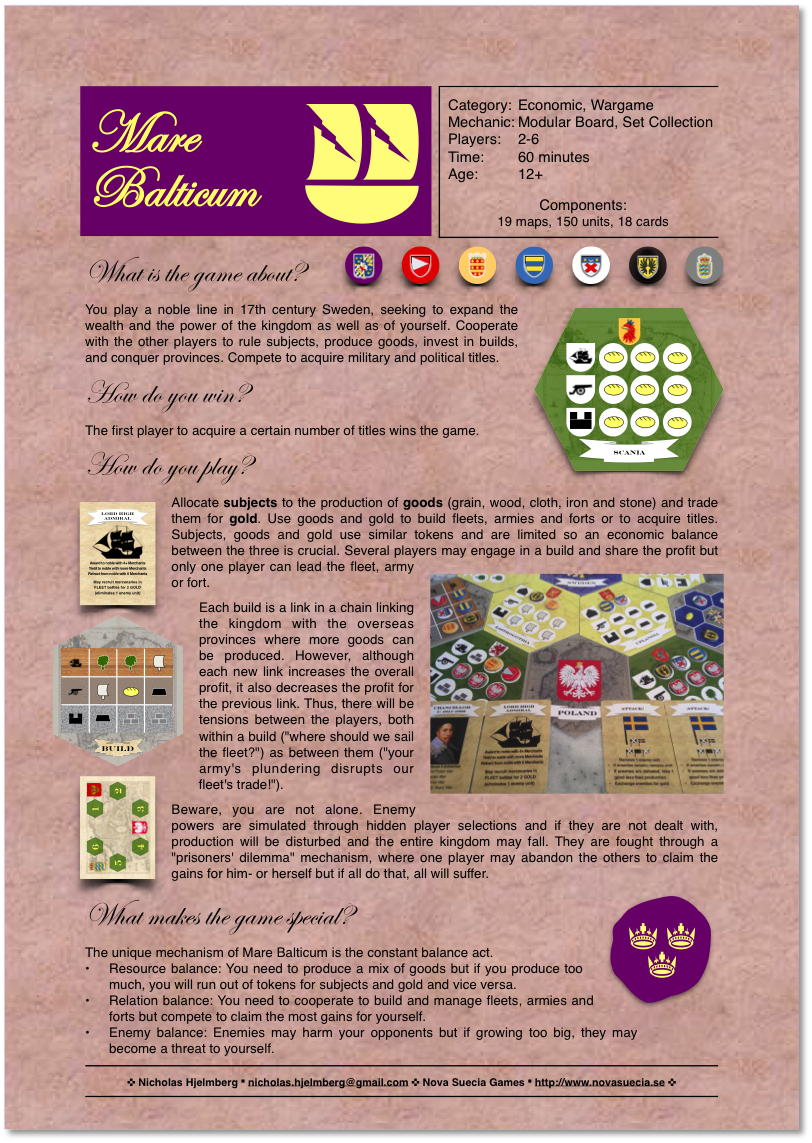 "This game of Swedish nobility is not the sort of thing that would normally turn my head but because it’s in ‘Flux Capacity Publishing Challenge’ I decided to give it the same attention as all of the other entries and I’m really glad that I did. You will see for yourself that all of the assets are really detailed and authentic looking. From the heraldic symbols to the historical mapping everything suggests attention to detail and a designer with a real passion for their subject. The rules suggest a game that is quite nuanced with elements of competition and cooperation. I see this as a game that would be the focus of a gaming night and one that would benefit from being played again and again by the same group of friends who like to learn and counter each other’s strategies. I think Mare Balticum will appeal to history buffs and strategy geeks everywhere and I for one would love to get to know it better."