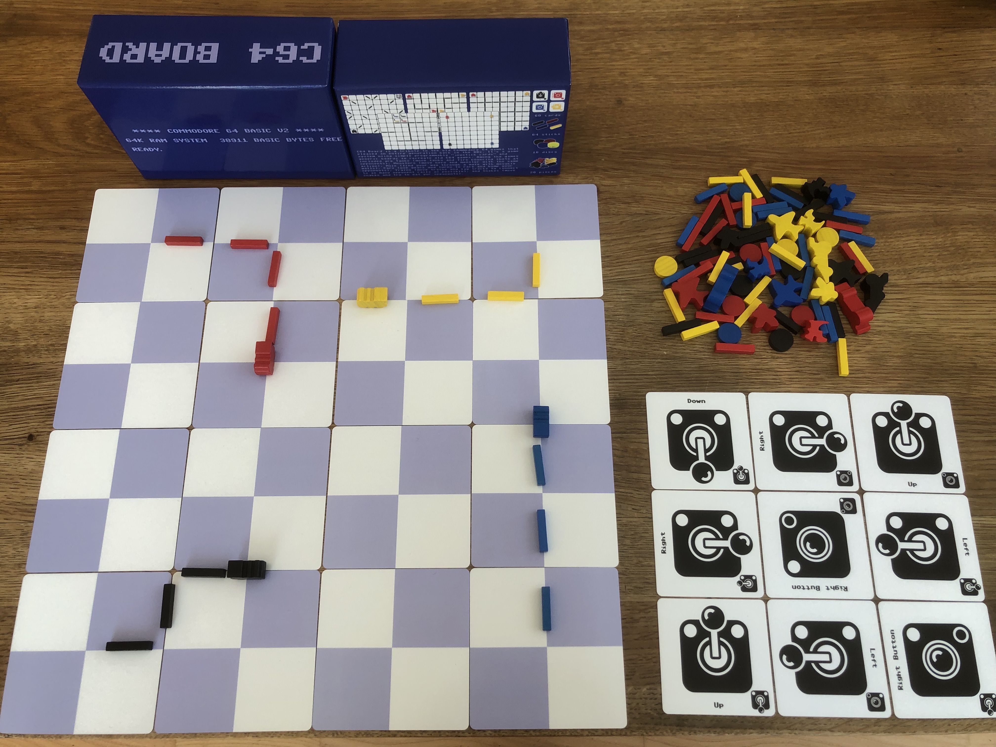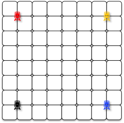 Empty board, 1 train in each player’s left corner grid point, 3 discs and 16 sticks (rails) per player.