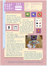 In Bake the Cake!, the players both cooperate and compete to bake the best cake. Players score by buying ingredients, preparing parts and baking cakes. Although the cakes belong to specific players, the players may freely use each others' ingredients and parts to bake them. All players participating in a cake will score but only when it is completed and only if the cake wins the final contest.