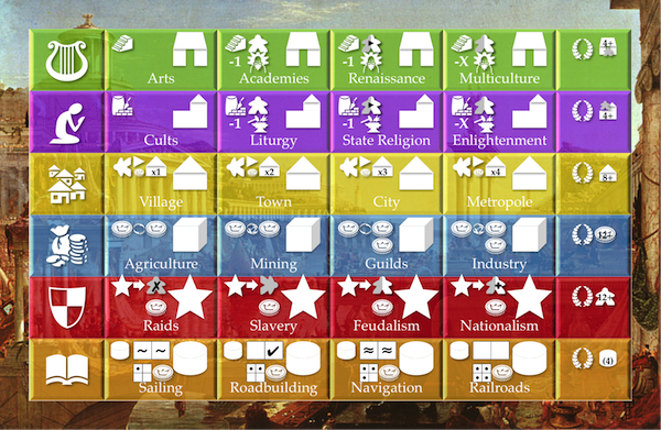 In our previous post, we decided, using Reiner Knizia's philosophy, not to try to model a specific environment, but instead try to invoke the thought and decision-making processes that are key to the theme. Our first challenge is that this perspective is anachronistic. Outside the megalomaniac dreams of mad dictators, civilizations do not follow the large scale millennia plans of one man. Instead, they are the result of the combined and often conflicting interests of many men and women over a very long time.
