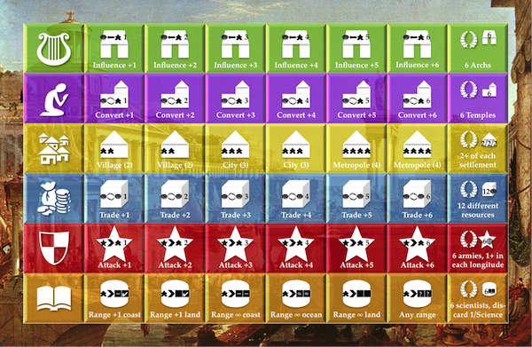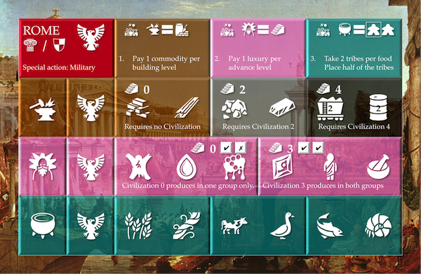 Another benefit would be the possibility to include multiple victory conditions. Thematically it does make sense - Rome may have been military stronger than Greece but the Greek culture survived the Roman Empire. The tricky part of the design is to balance the different victory conditions so that not one civilization trait is stronger than another but that will be a later task for the game testing and tuning.