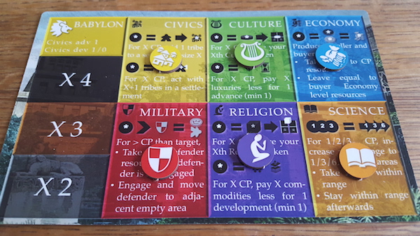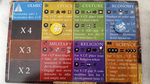 Culture and Religion could let the players use the markers taken from their technology boards as
