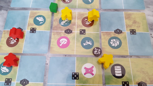 Engine decisions: In their actions, players can choose to produce resources on the tile or