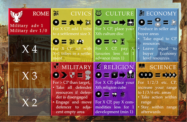 Finally there was a breakthrough as I decided to remove all Revolution bonuses and link each civilization trait with a civilization action bonus instead. I made sure to give each such bonus a unique ability that yet would help driving a strategy towards a goal.