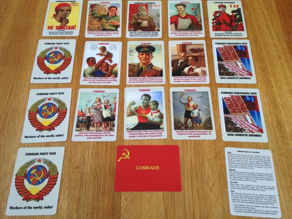 Comrade is a deduction game with the classic concept of hidden identities. Add to this the double objectives of an informer trying to find a dissident while the dissident tries to influence as many others as possible. Complete with shifting identities so that the players can never be sure who is currently the informer and who is currently the dissident. All this for 5-10 players but only 18 cards!