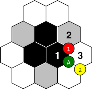Let's take the extreme example to the left where player A has placed on 3 battle stations on triple points,