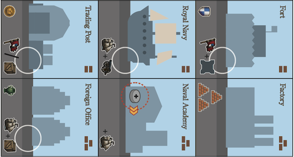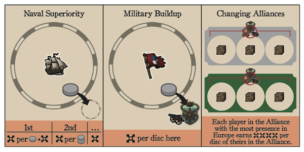 The prominence tiles remind a bit about the Exploits by providing additional options for your actions. Two examples are Naval Superiority and Military Buildup, both of which let you place population markers there and either use them in later actions on the map or leave them there to score victory points in the end.