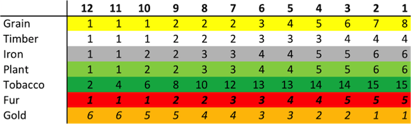 got important for colonists (to engage in the production) and fur got important for the colony (to pay taxes for common expenses). Thus all production types have a bearing on the game balance!