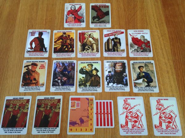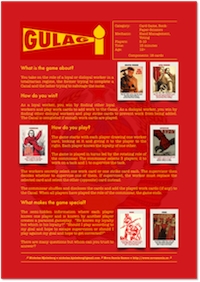 Gulag is a deduction game with the classic concept of hidden identities. Add to this the double objectives of loyal workers trying to complete a task and disloyal workers trying to sabotage the same. Complete with the semi-hidden information where each players knows one player and is known by another player and you have a paranoid gameplay. All this for 5-10 players but only 18 cards!