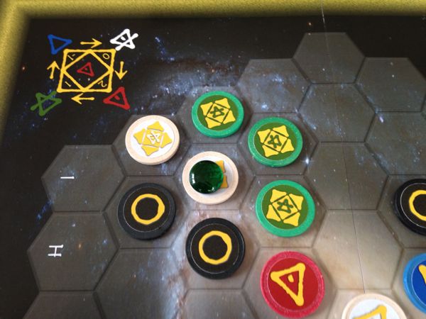 The initial design relied on fixed colors and relations, where each player had fixed number of tiles of each color to play and a fixed support from another color. The reason was simply to remove all randomness but this also gave the game a slightly lethargic feeling, as pointed out by some game testers. But could a game like Iconoclasm be both dynamic and non-random? The answer came from another cyclic abstract game: Tao Long, where a mancala mechanism governed which actions that are available for the players.
