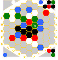 In this version, a Mancala style mechanism determining colors to play and support relations