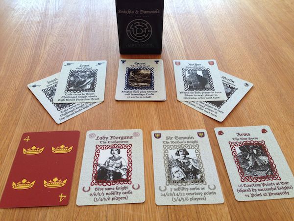 But besides the above role playing, Knights & Damosels also offers many tactical opportunities. Knights may draw cards that leave their opponents with less options or even provoke them to risk a joust. Damosels may guess "their" knights' intentions and play the cards they need. The special rotating roles of Arthur and Merlin may be used to intentionally fail a quest to hurt opponents and reap all the rewards to the own knight or to find out which knights that are most influenced by the own damosel."