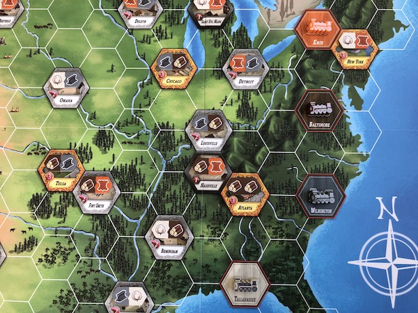 To lay tracks, a player chooses a city to connect to and takes as many trains from the rail company’s supply as needed