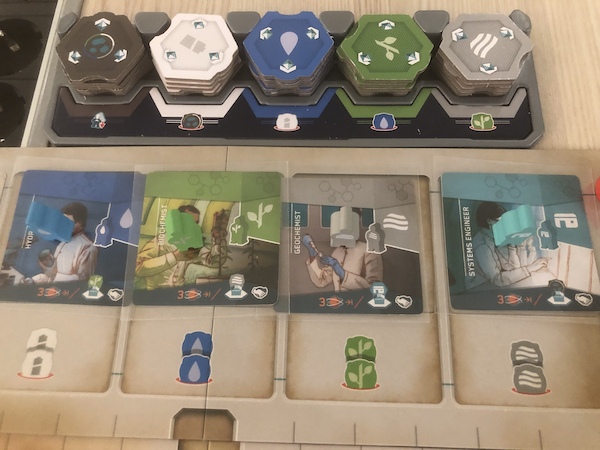can be used to get shelters (from the player boards) to house colonists to get minerals. Similarly, energy can be used to get a water scientist and so on.