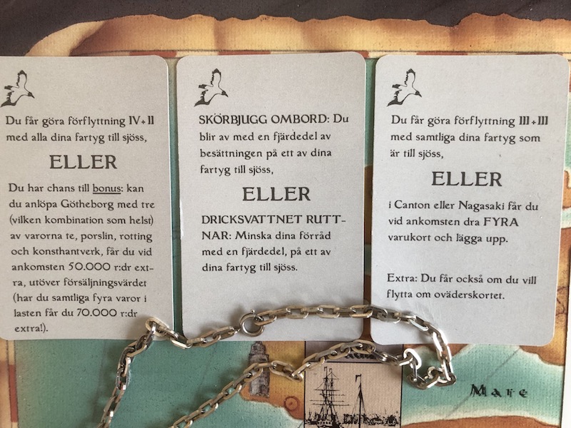 OK, so now you have sailed around the Cape of Good Hope and have to make a decision where to proceed; India, China or even Japan. The further you go, the higher the potential profit. Your action cards may assist you in your decision if they reward certain combinations of goods, as will the storm card if it happens to block any of the ports right now. Otherwise only memorization of the goods cards in the different markets will help you assess whether a close port or a more distant port is the most profitable one over time.