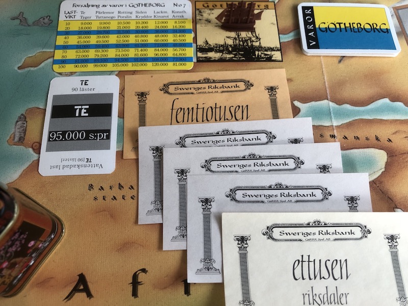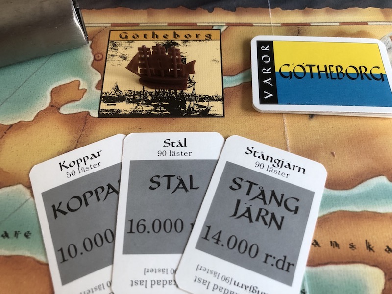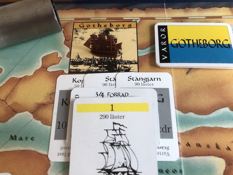 Finally you're back in Gothenburg with all your overseas goods. Similar to trading goods, you decide whether and which goods to sell at the current market card prices. Here you'll find the widest price ranges of the game so use your skill (or luck) to get the best possible return on your investments. After this, it's time to repeat the cycle. Well, there are two more decisions.