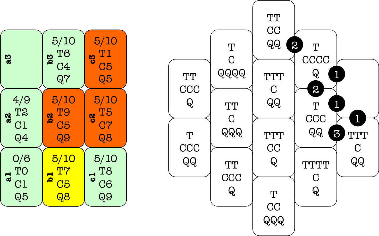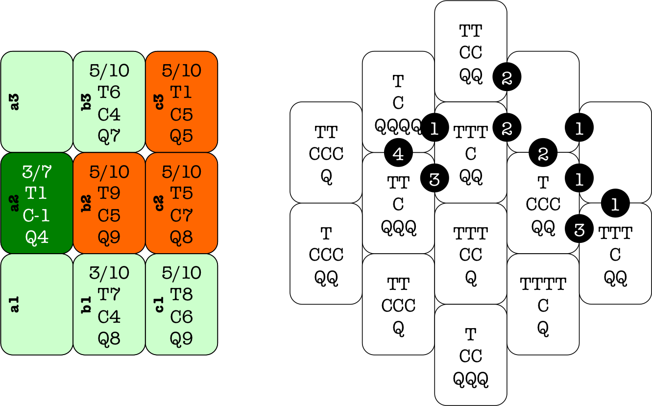 (T=time, c=cost 4, Q=quality) and numbered circles for the players' seats.