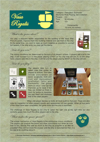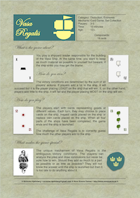 "The ambigiuous victory conditions of Vasa Regalis is what really makes the game unique and ensures that it is open until the very last game turn. A player may choose to put as much as possible on the ship, hoping that the other players will be greedy and cause it sink. Another player may choose to keep the goods for herself, hoping that the others will pay for the ship. The winning strategy will not be disclosed until the game is over and all cards turned face up."