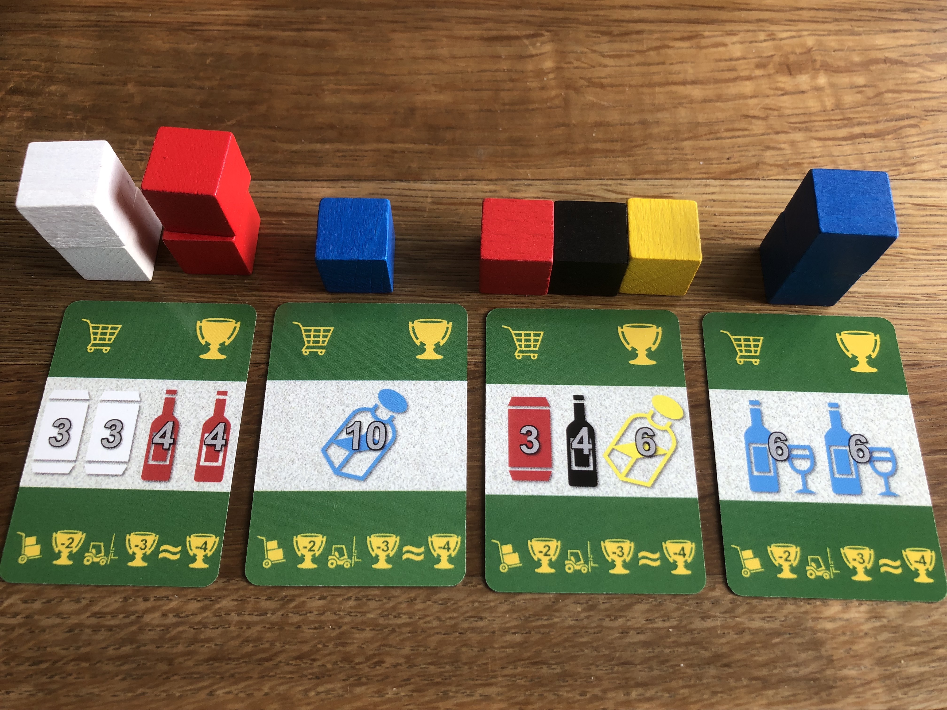 1 game board with stock spaces (brown), buffer spaces (gray), shelf spaces (white, blue, black, red, yellow).