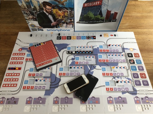 Smartphone puts the players in charge of companies aiming at developing, manufacturing and marketing smartphones globally. The game is played over five rounds, each of which is divided into eight phases. Each phase contains a business decision that takes your company one step further towards global market domination and when the game is over it has hopefully grown from a local start-up to a multinational corporation. Victory points are awarded mainly for sales (price times volume) but also for "market dominance" (selling most on a market) and patents (first to research a technology). The player with the most victory points wins.