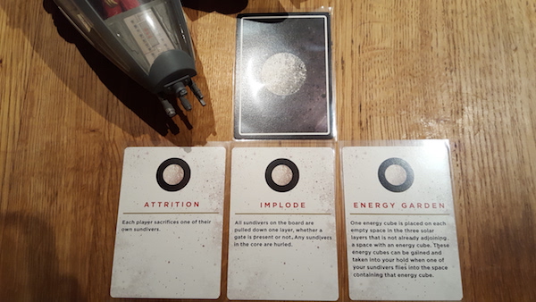 The trigger cards are also shuffled into the instability card deck and trigger certain events when drawn. Those events may be either positive (e.g. Warp allows a free movement of a sundiver) or negative (e.g. Explode pushes all sundivers one layer away from the Sun). You will know the upcoming event but not when it takes place so they aren't completely random.