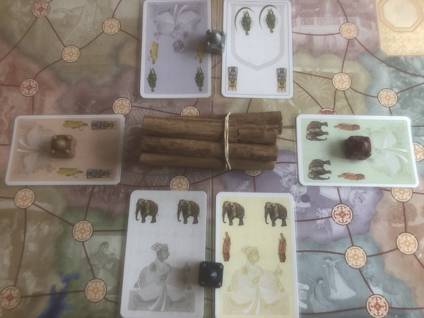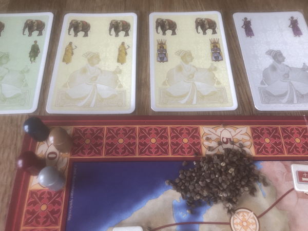 The special cards have unique bonuses: an elephant, +2 victory points, a Grand Mogul and the ability to play a card of another color.