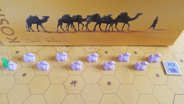 With whoever is closest to the valuable spots? No, there is more to this decision. Did you wonder why it was necessary with five different colors of camels? One reason is that opponent camels of the same color can not be placed next to each other. This is not only because it would be difficult to tell them apart but also because it can be used to block opponent caravans and cut them off from valuable areas. Another important reason is the third way to score: the longest caravan of each color scores 10 victory points.