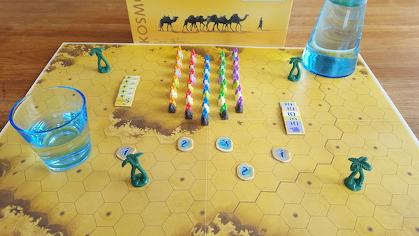 First of all, you do not place tiles but colorful camels. Functionally there is no difference compared to tiles but the camels do stand out on the board, for better or worse. Some players shudder at the very thought of playing with pink plastic camels while color-blind players find it difficult to tell the camels apart. If you belong to either category, Through the Desert is not for you. Otherwise, please read on.