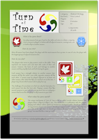 Turn of Times is a simple and yet tactically deep game where players take turns to place their seasons in the world. Initially, the seasons are in balance with Spring followed by Summer, Summer by Fall and Fall by Winter as time goes by. However, the players may also literally turn the time to their advantage by turning the game board parts so that later seasons replace earlier until their own season dominates the world. But time is not meddled with without danger. As your season enters one part, other seasons may enter other parts with unpredicted results. And if the the time is turned back in the entire world, not even the Lords of the Seasons may predict what happens. Will the world have eternal summer or eternal winter? Play Turn of Times and find out!