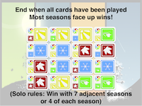 Once a season is banished from an area, it may not easily return, so the players will gradually increase their local dominance until a global winner emerges. To win Turn of Time, you must find the turns that brings most of your seasons to the board while blocking your opponents' opportunities to replace your seasons.
