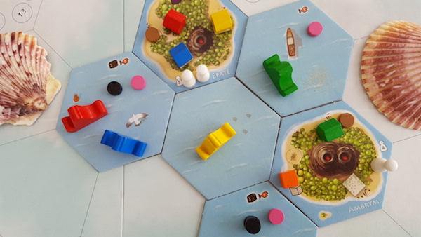 Most actions in the list above are linked to where your ship is and which pieces and spaces that are available on the tiles around it. Build and drawing spaces are limited, tourist pawns are limited, as is the capacity of an island to receive them, treasure and fish discs are limited and so on. The only exception concern the Buy action, where completely exhausted islands get new goods and where completely filled ships get replaced.