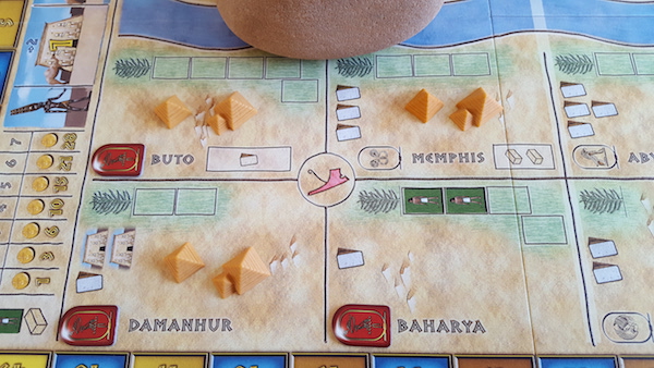 To succeed in the eyes of Amun-Re, you need to balance between farmers (for gold) and pyramids (for victory points),
