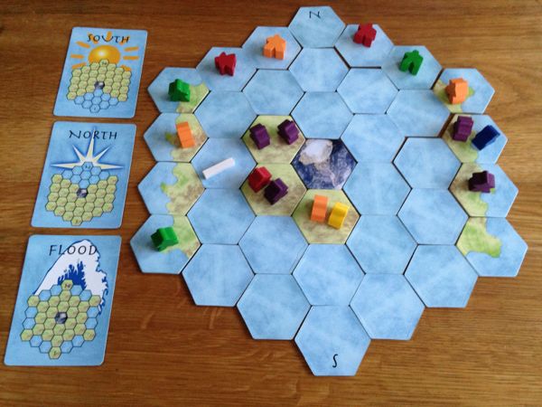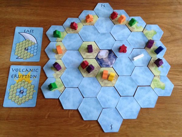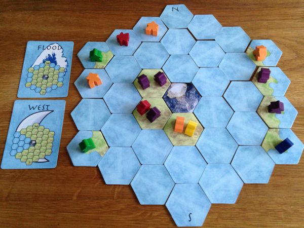 but decides to go for East, hoping that the other players will push the black meeples to danger.