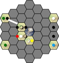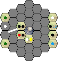 The meeples are denoted with colored circles; filled in the hexes they stand in