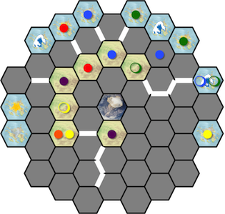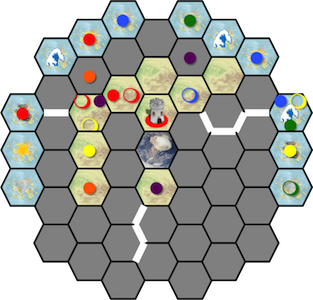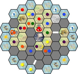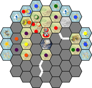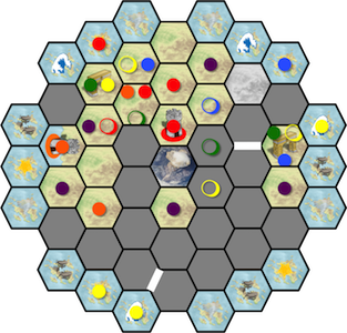 The meeples are denoted with colored circles; filled in the hexes they stand in