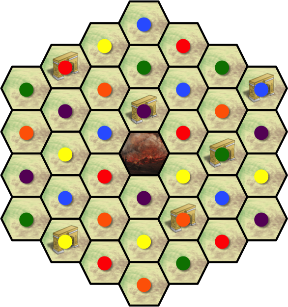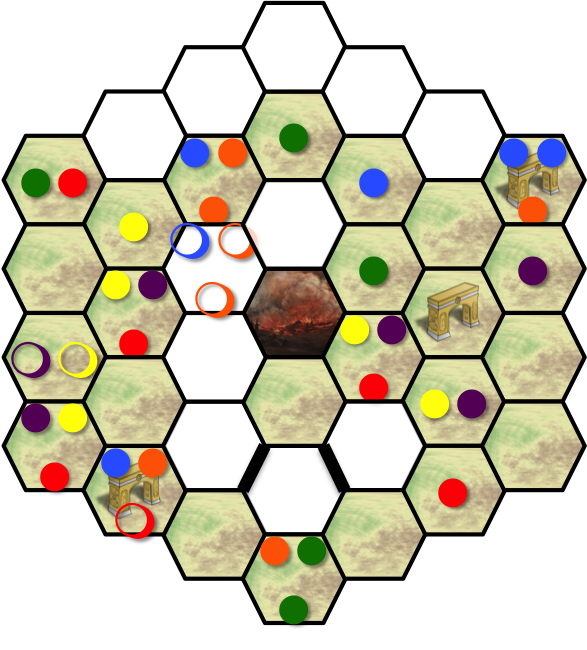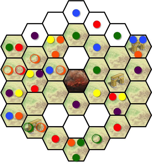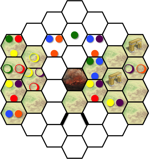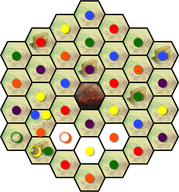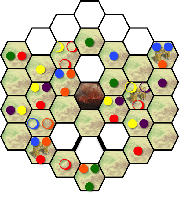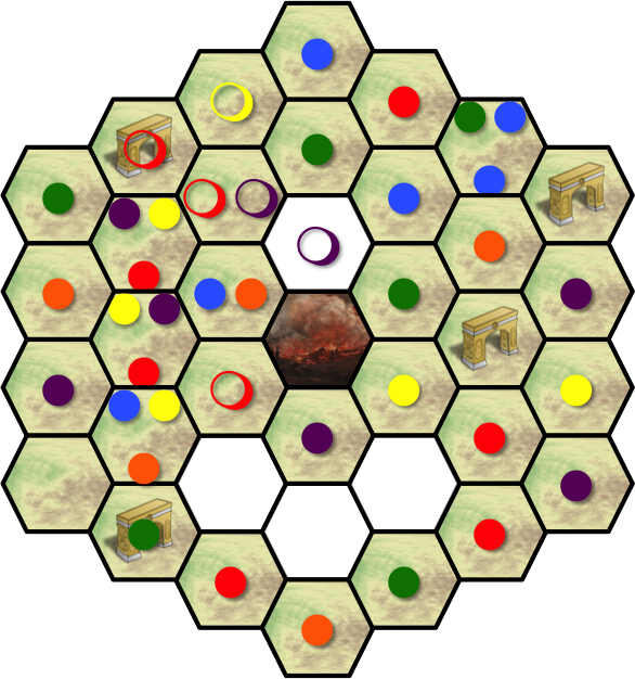The meeples are denoted with colored circles; filled in the hexes they stand in