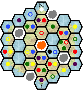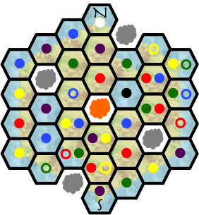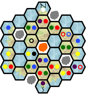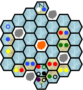 The meeples are denoted with colored circles; filled in the hexes they stand in